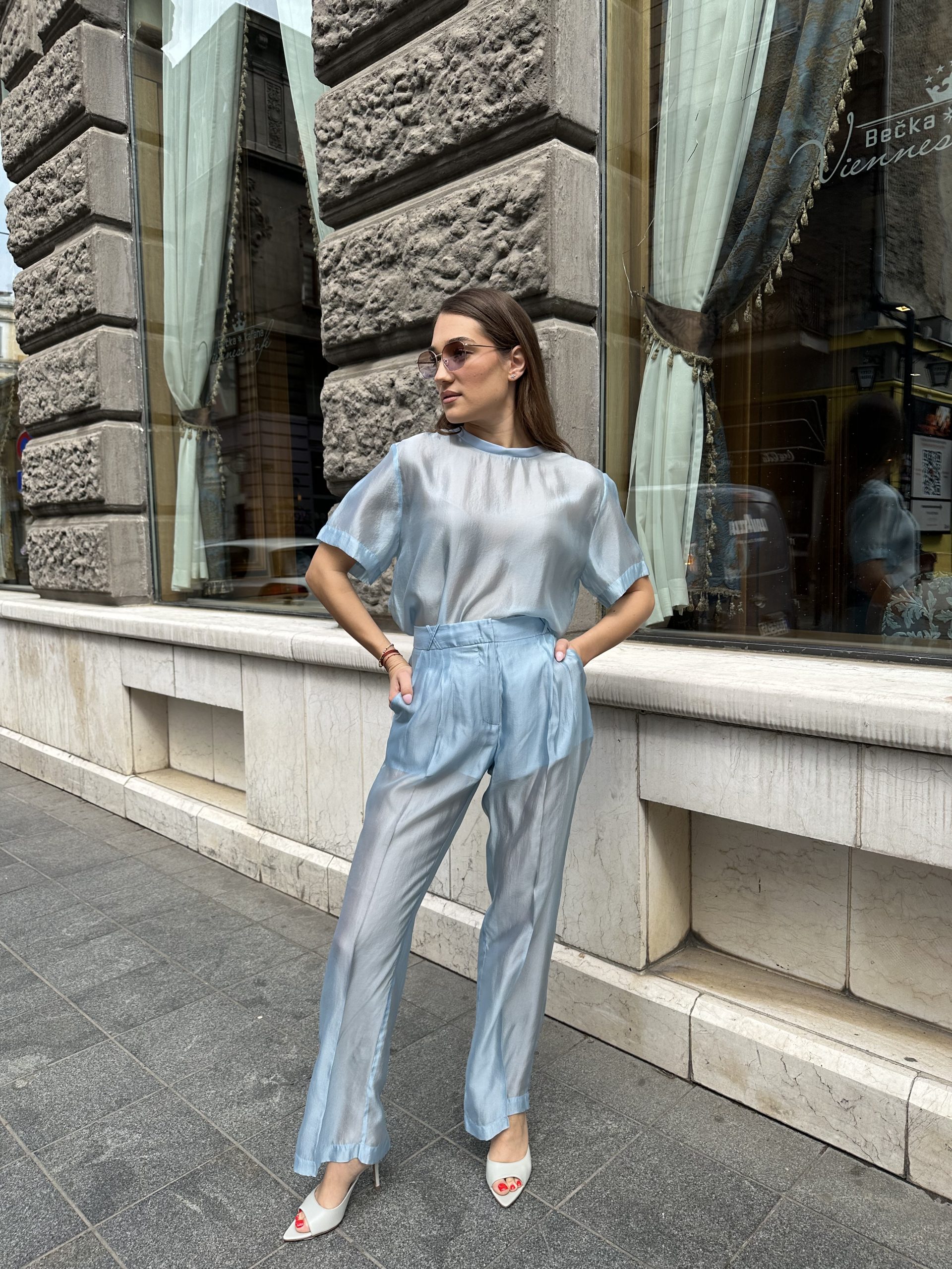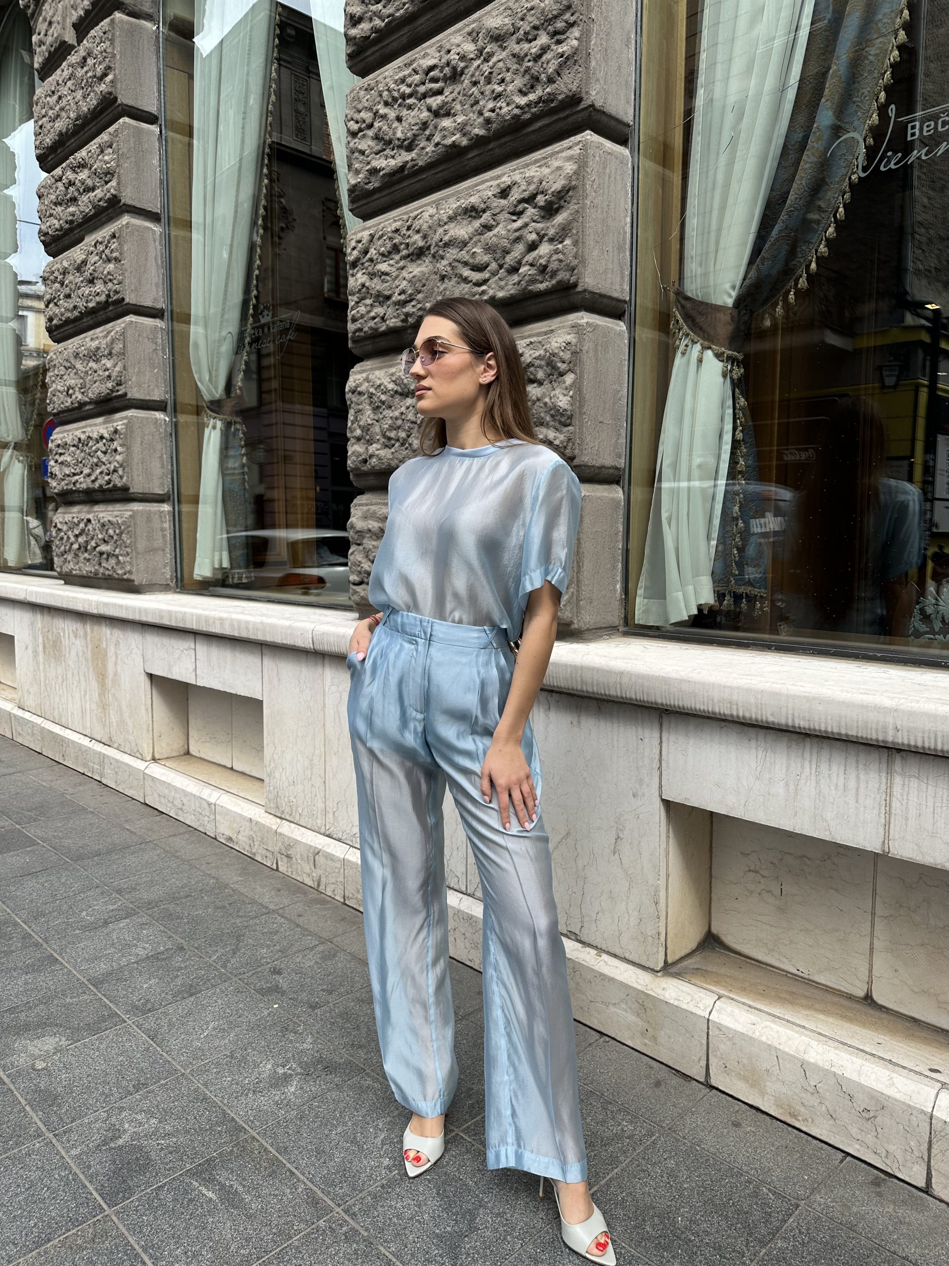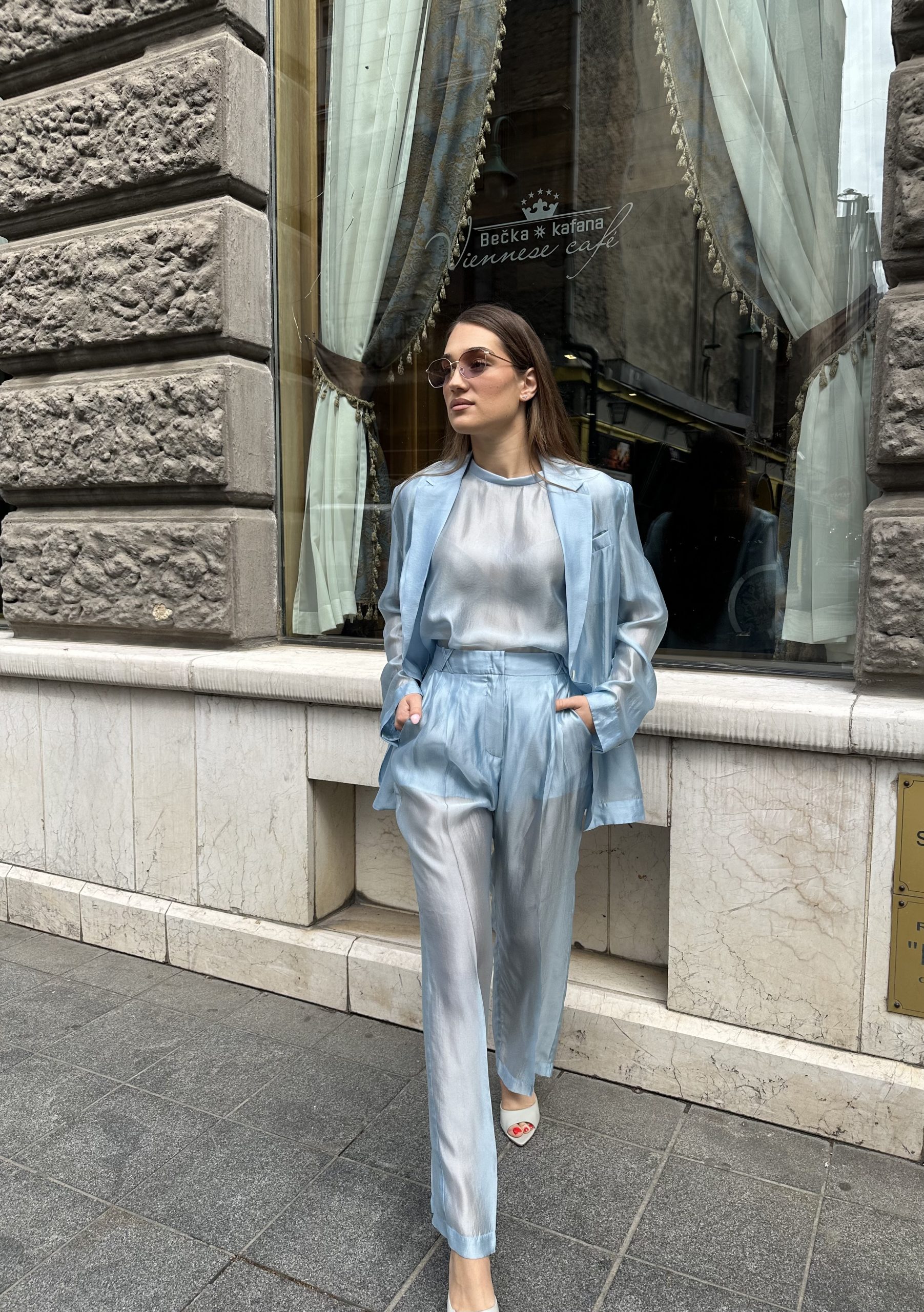 The Gilian Pants are a tailored suiting pant made from sheer material. Their relaxed fit and sheer fabric adds a touch of sophistication.