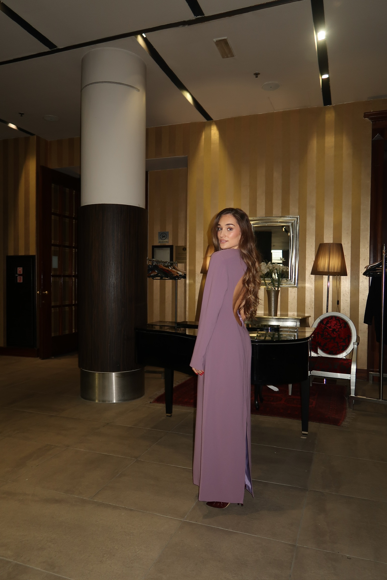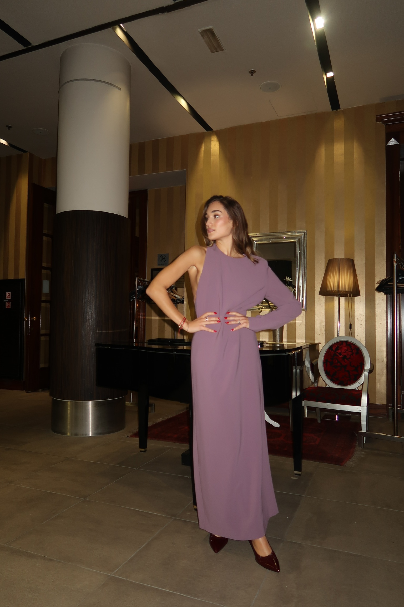 CREPE CADY LONG DRESS, CREW NECK WITH ASYMMETRICAL SLEEVES AND LARGE CUT-OUT