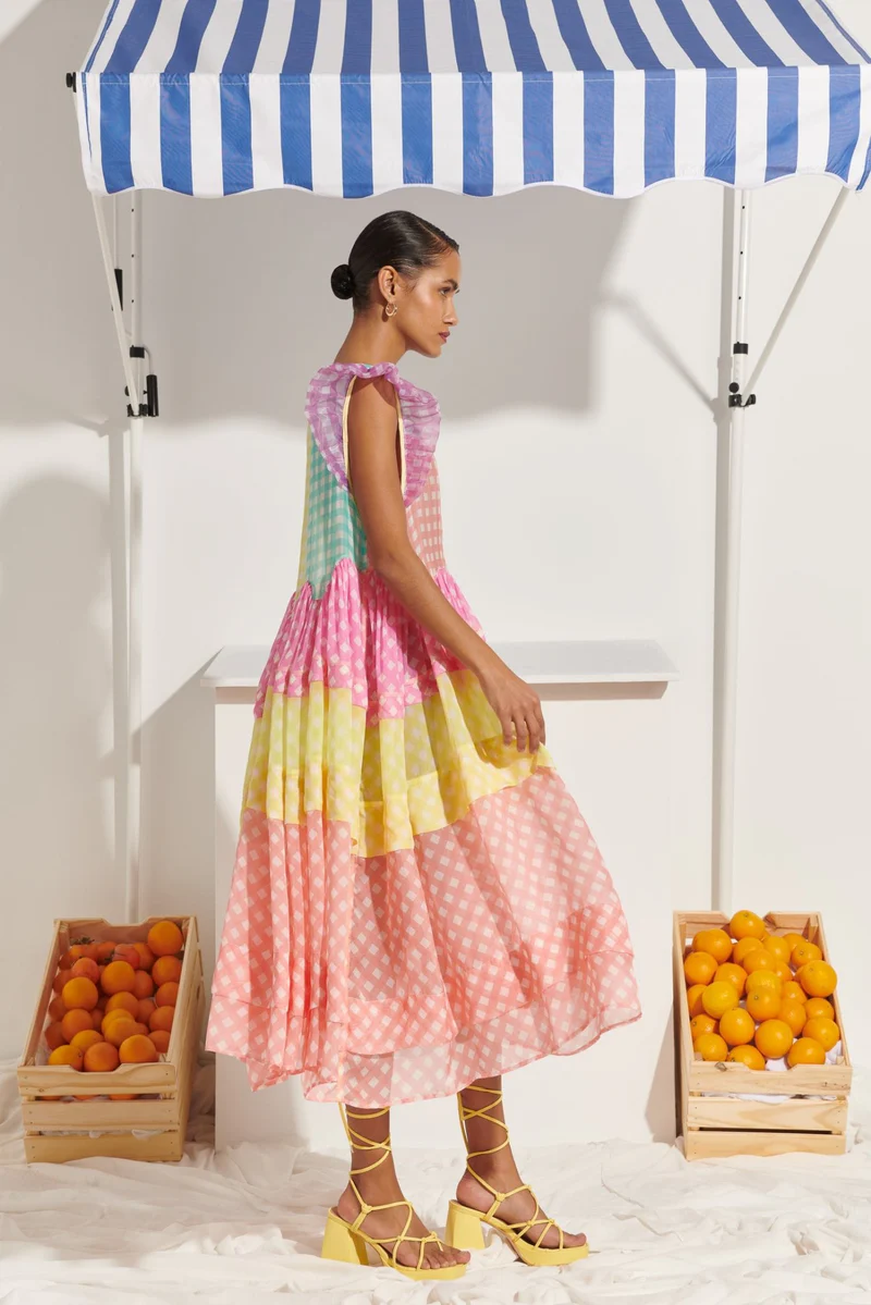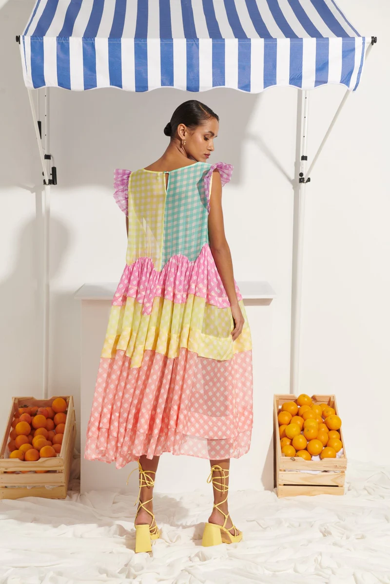 Light as air and full of charm, the Manuela Dress layers pastel checks in pink, yellow, lilac, and aqua for a dreamy patchwork effect. With ruffled shoulders, a relaxed silhouette, and asymmetric hemline, it flows with every step. A feel-good piece for feel-good days.