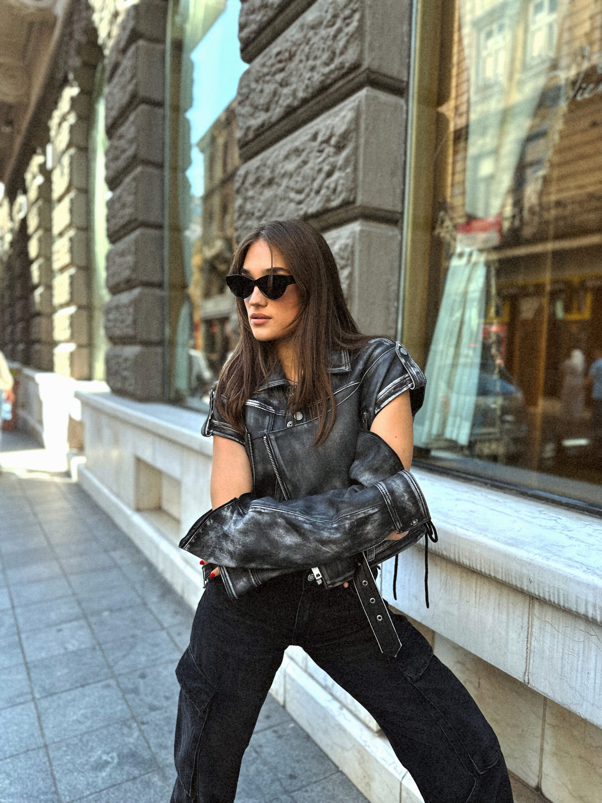 This distressed leather motorcycle jacket is crafted with genuine sheepskin leather. Adorned with silver-tone buttons, zippers, pockets, laces, and a zip detachable sleeve so it can be worn as a leather vest.