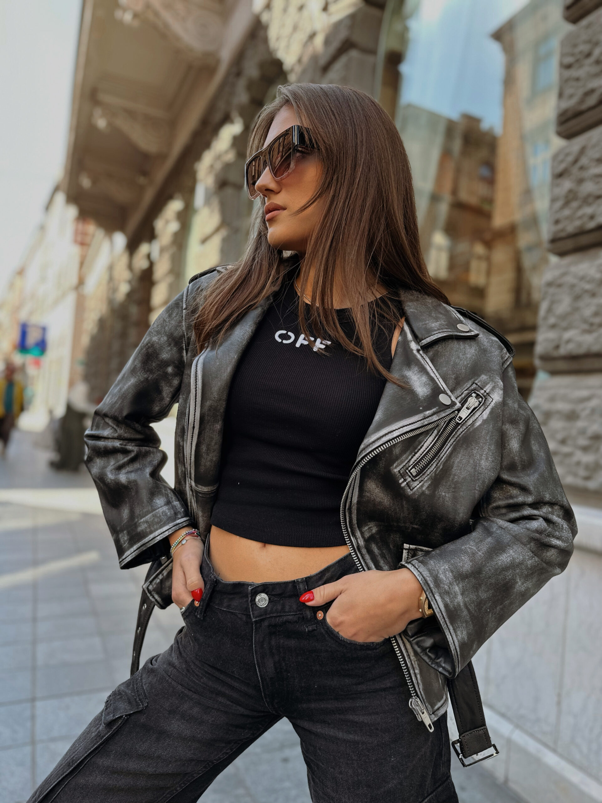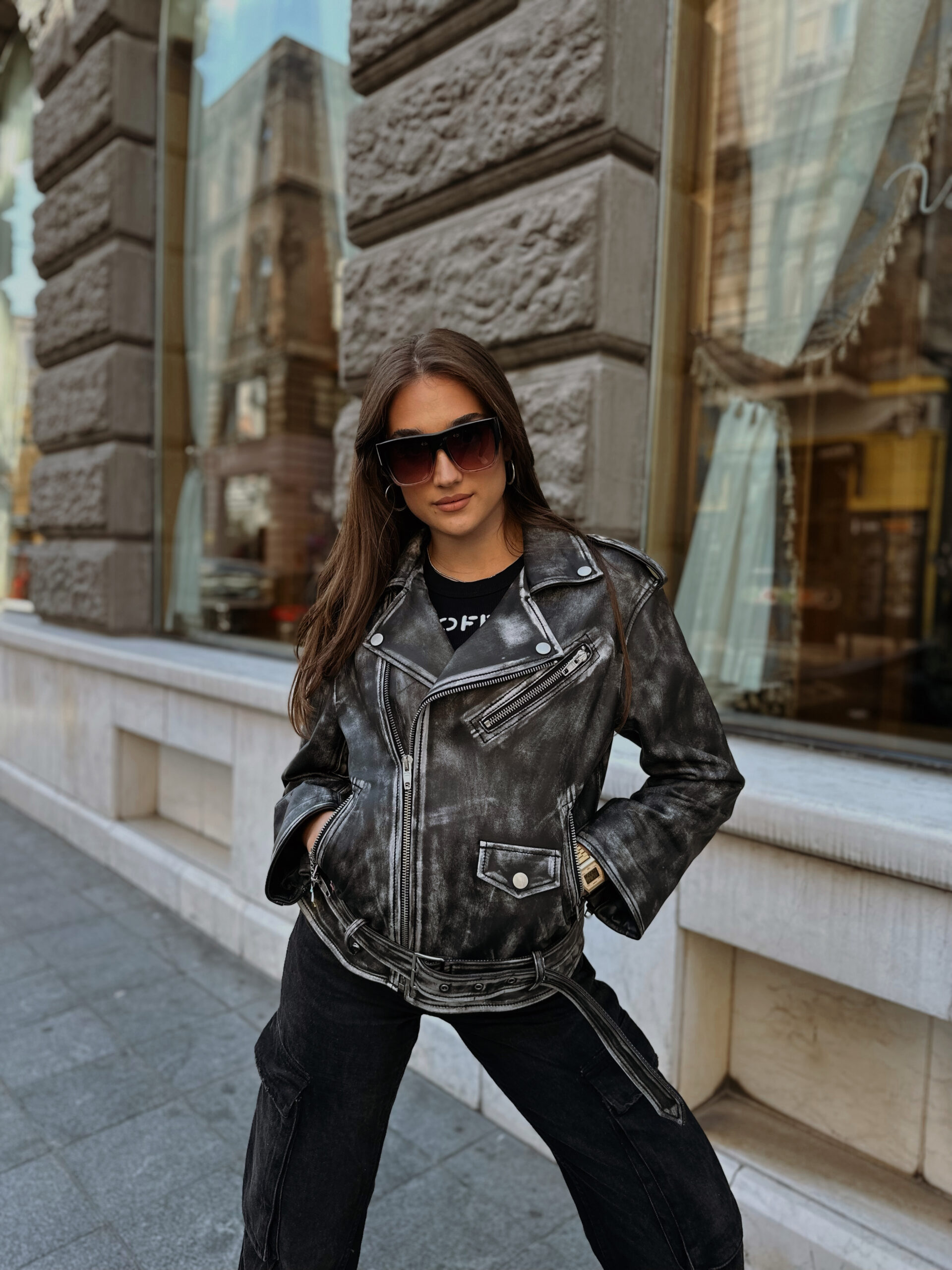 This distressed leather motorcycle jacket is crafted with genuine sheepskin leather. Adorned with silver-tone buttons, zippers, and pockets, it is a versatile design.