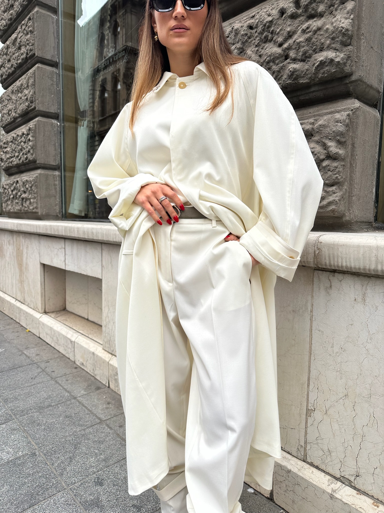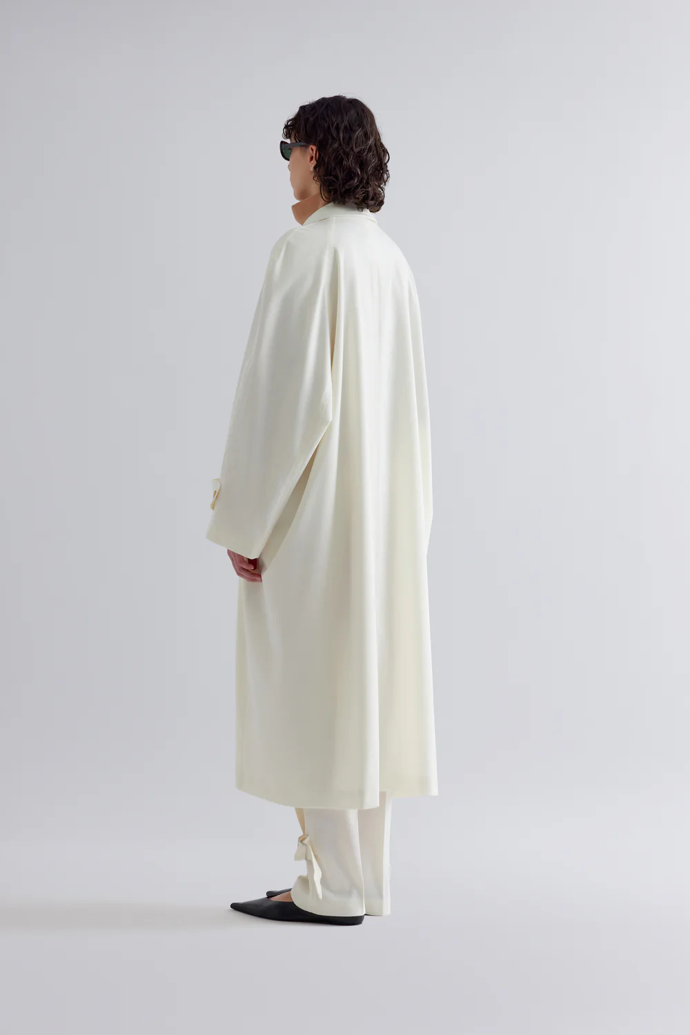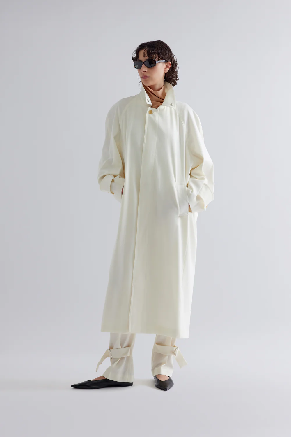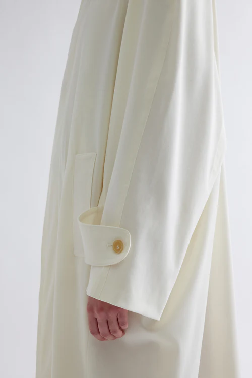 WOOL GABARDINE LONG TRENCH COAT, DOUBLE-WEARING COLLAR, LONG RAGLAN SLEEVES AND FROGS AT THE BOTTOM, HIDDEN BUTTON CLOSURE.